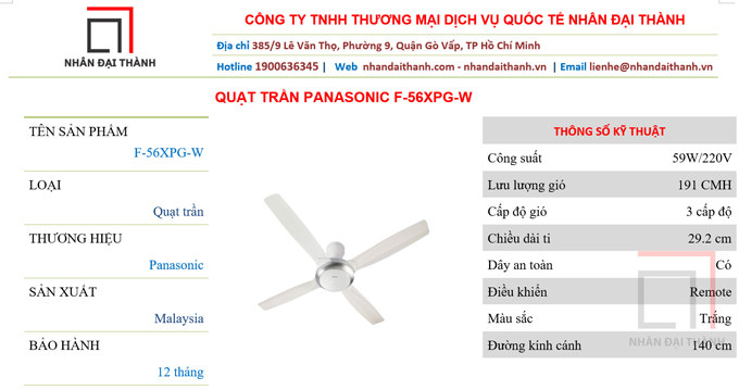 Quạt trần Panasonic F-56XPG-W đang được bán với giá đại lý tại Nhân Đại Thành - Quận Gò Vấp, TP.HCM.