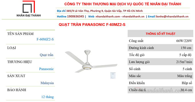 Quạt trần Panasonic F60MZ2-S đang được cung cấp tại Nhân Đại Thành với đại lý tại Gò Vấp TPHCM.