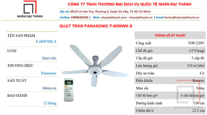 Quạt trần Panasonic F-60WWK-S đang được bán với giá đại lý tại công ty Nhân Đại Thành quận Gò Vấp TPHCM.